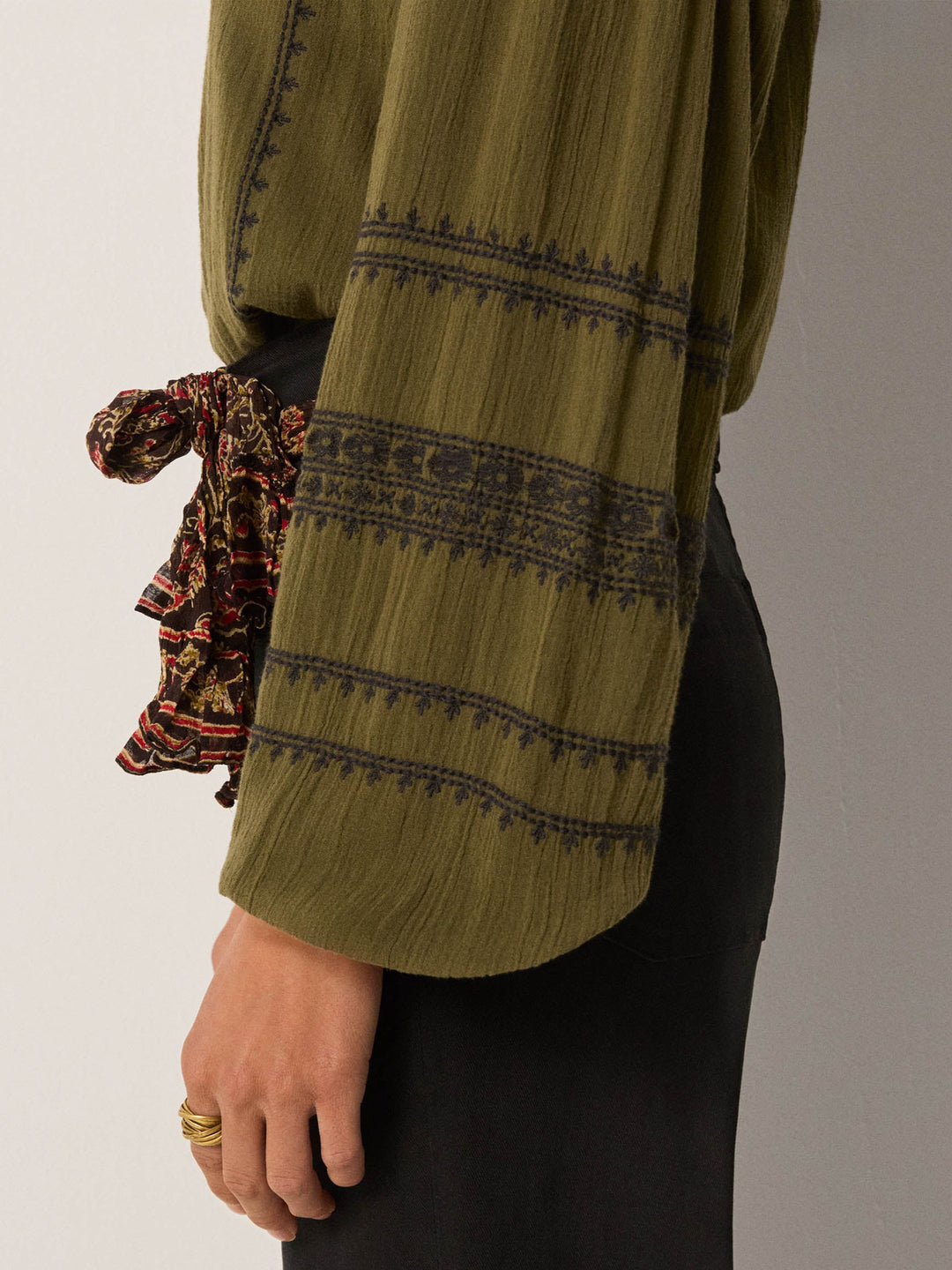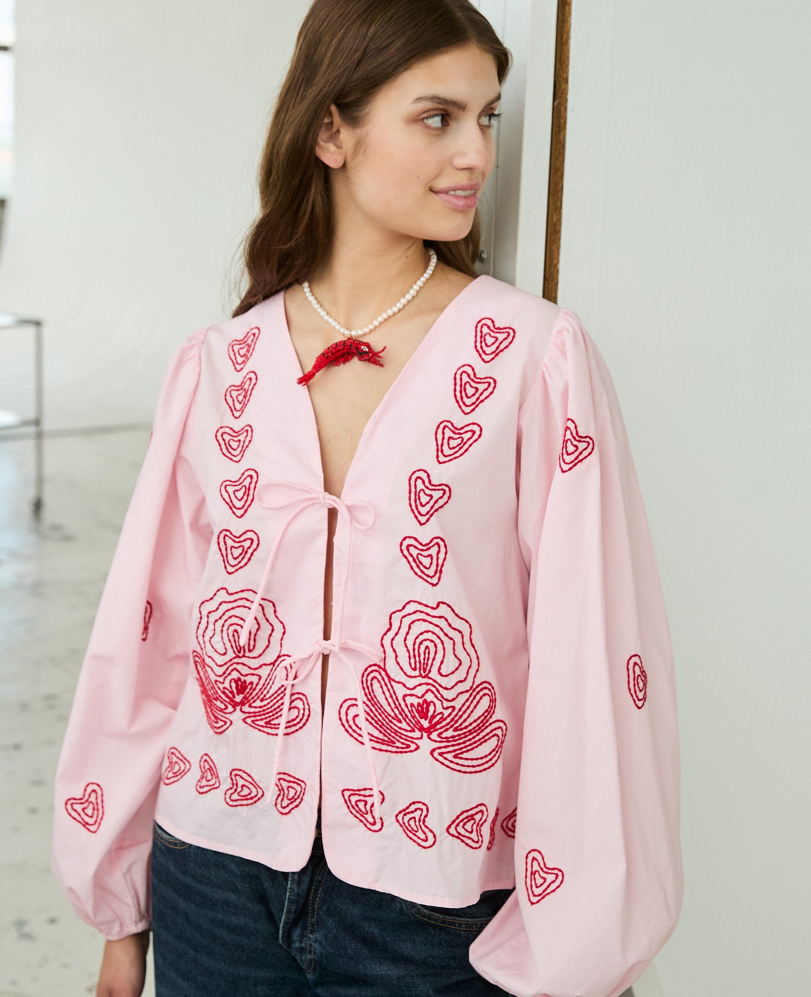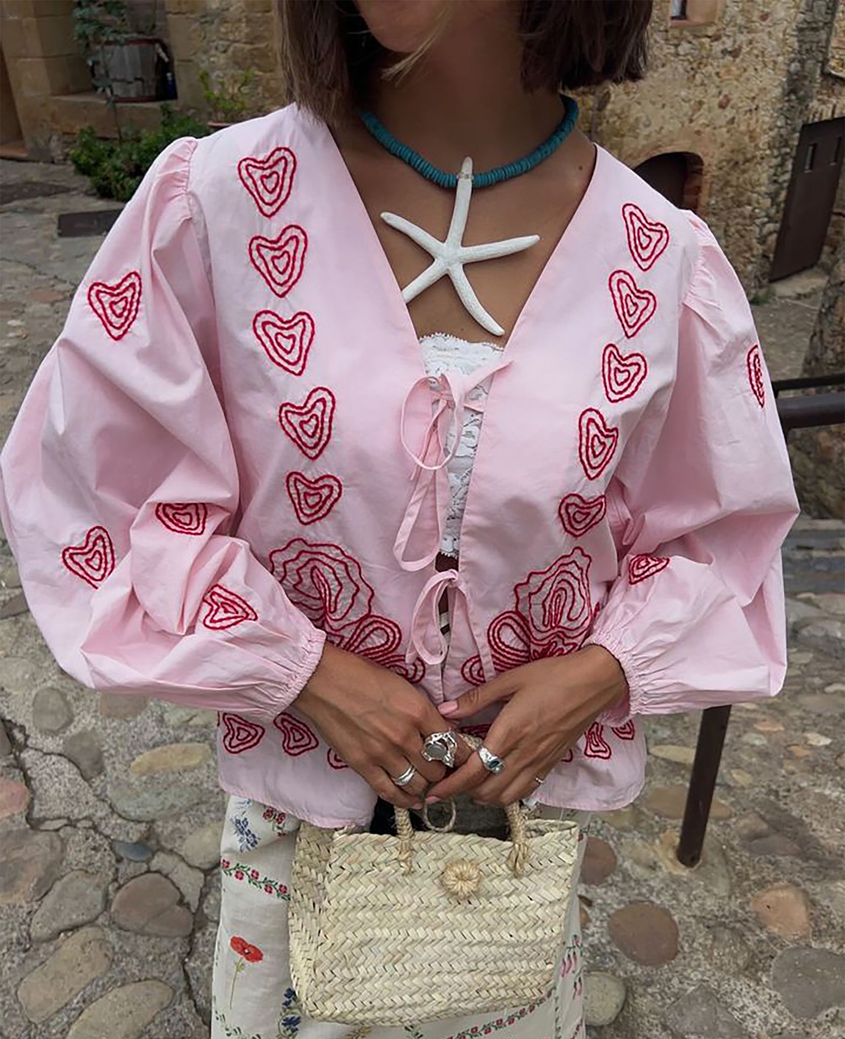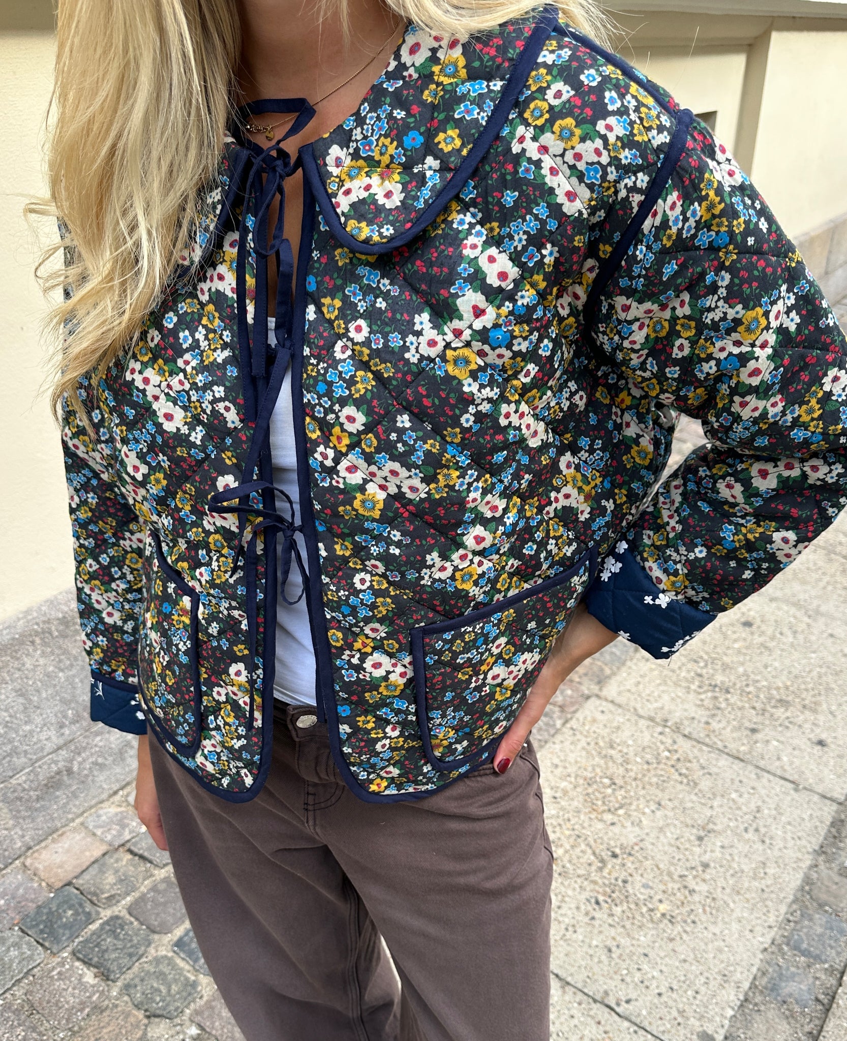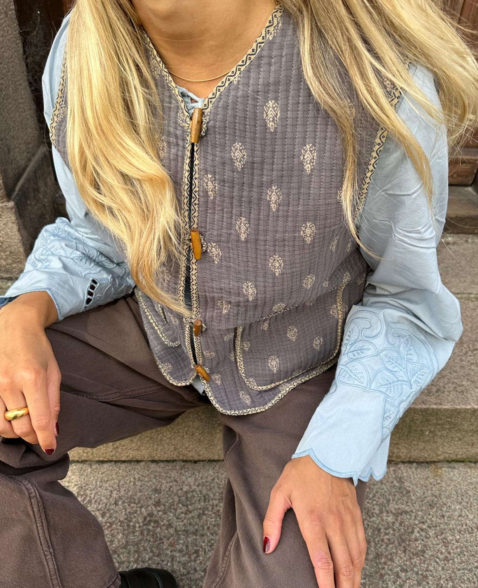 - Trim: Striebånd med tynt tau og treperler, bundet på siden