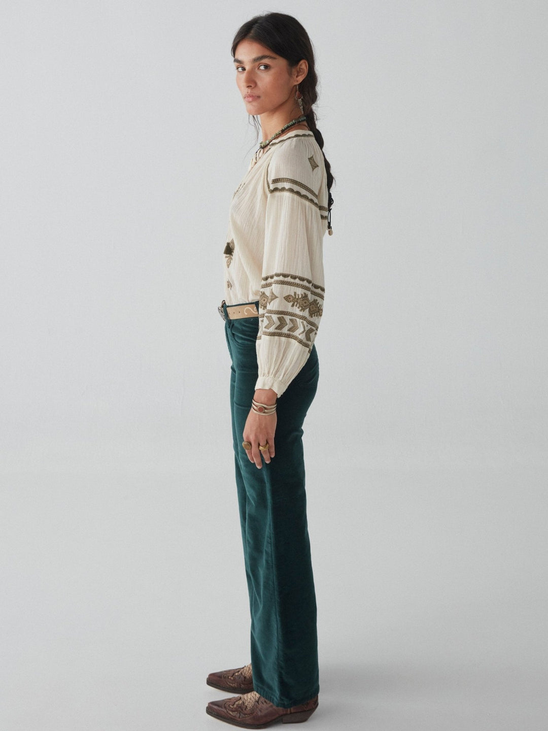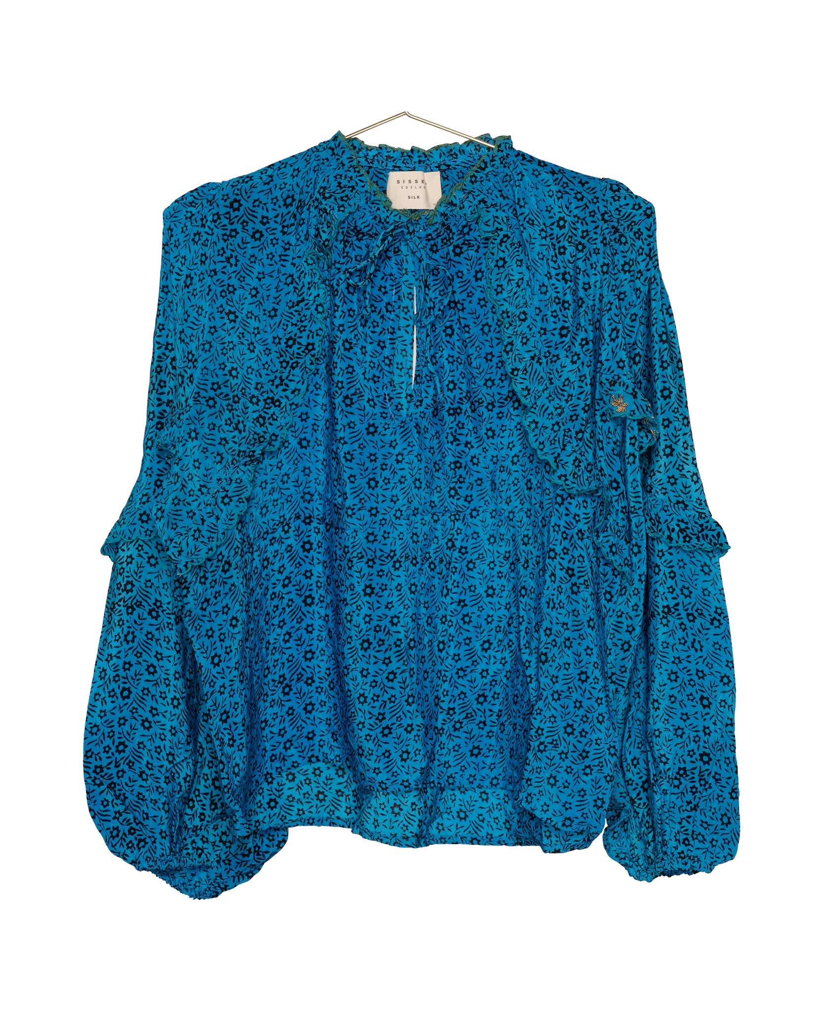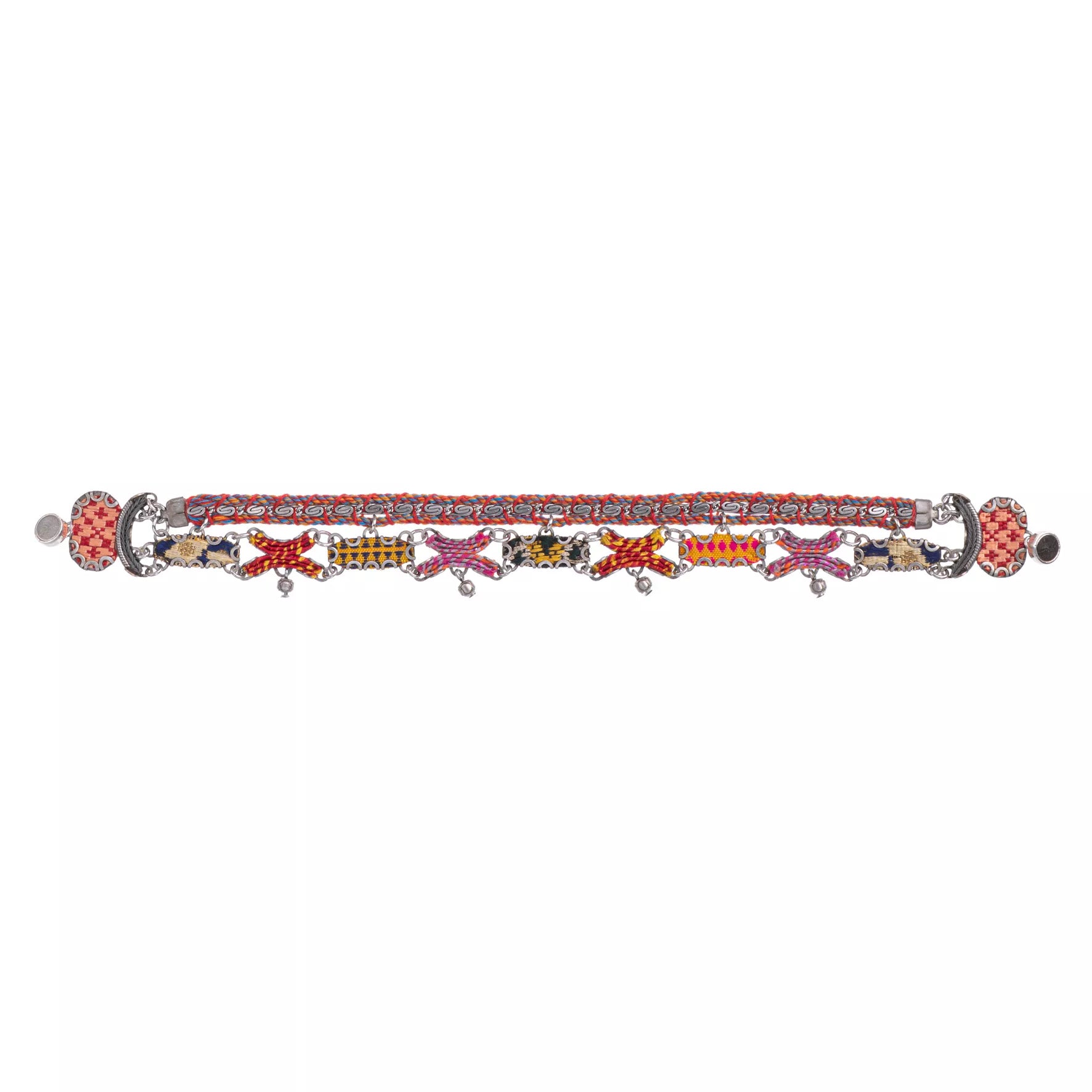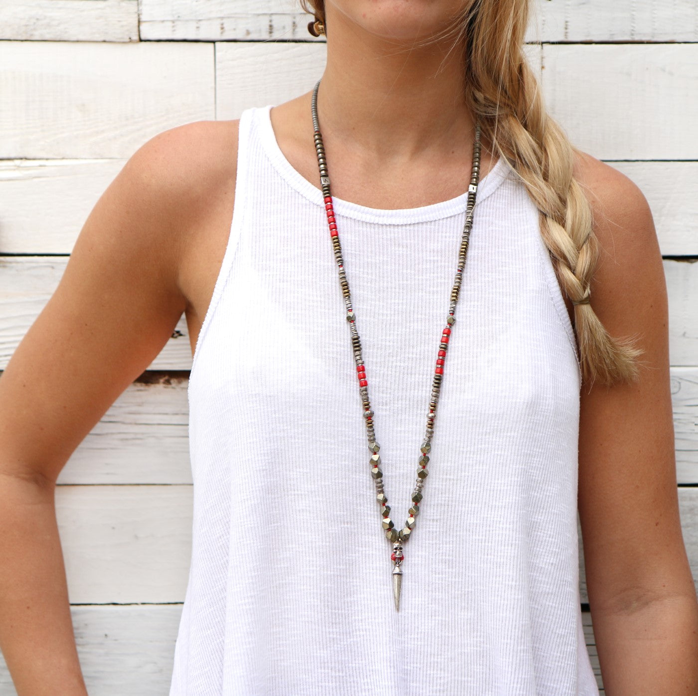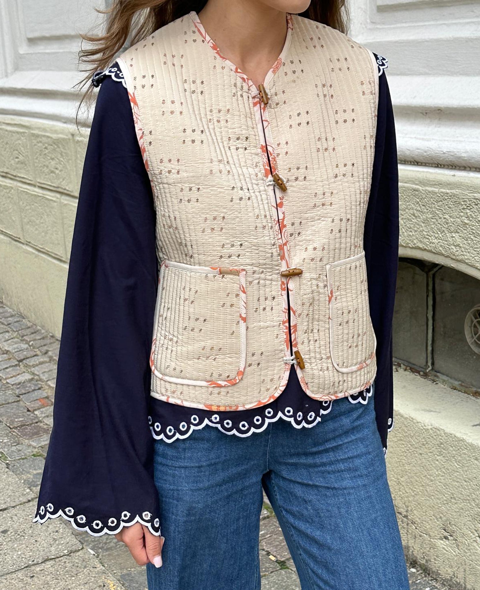 - Trim: Striebånd med tynt tau og treperler, bundet på siden