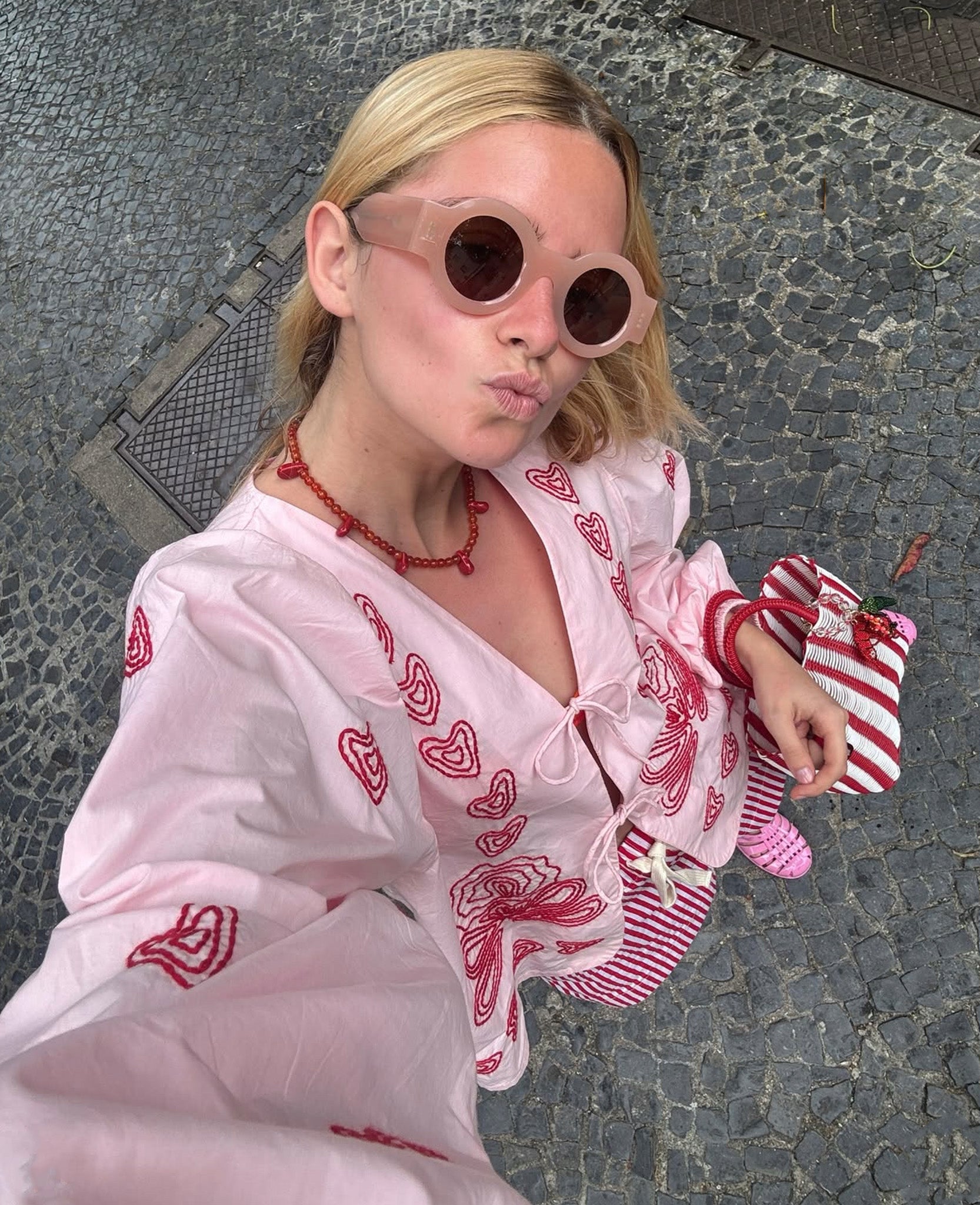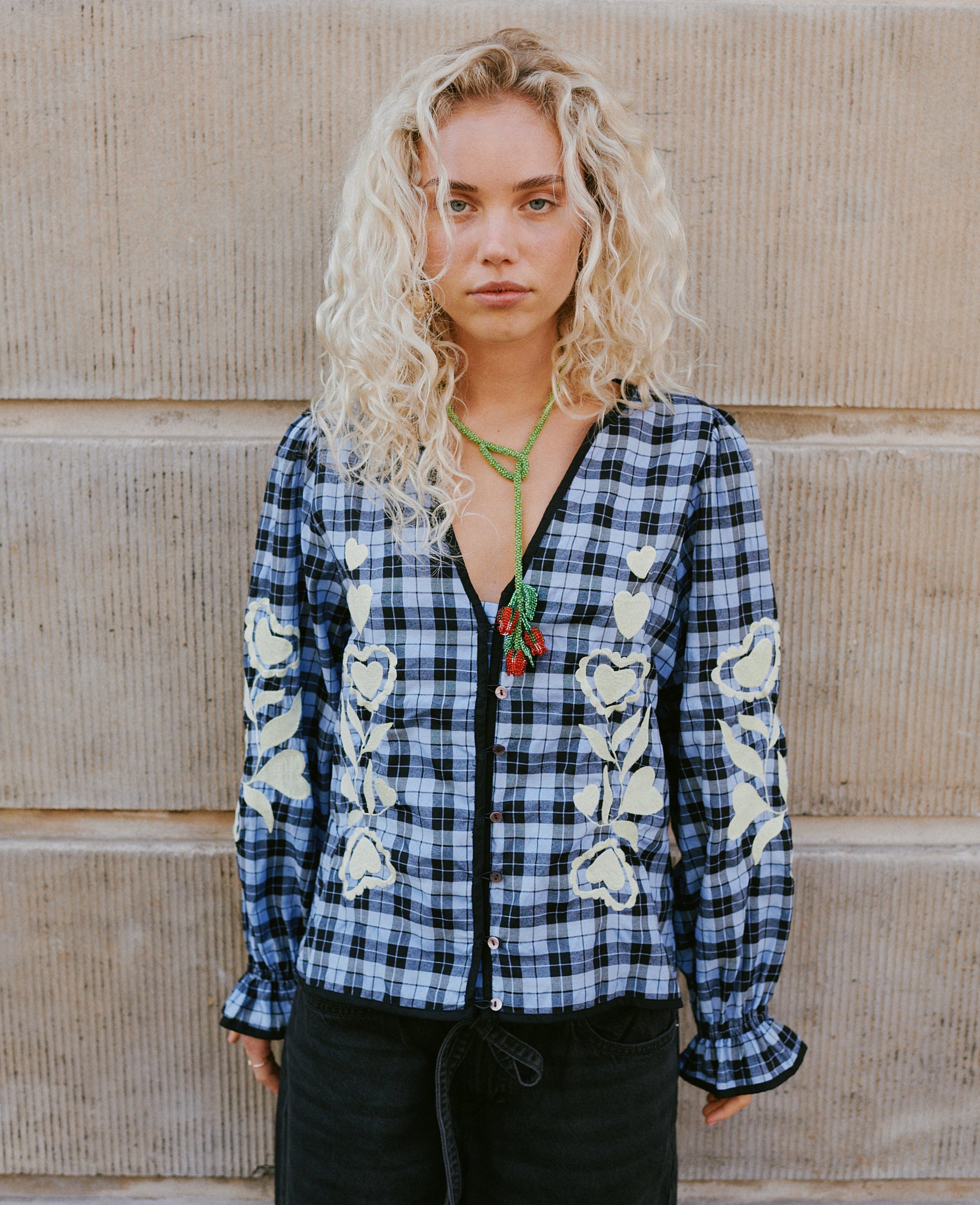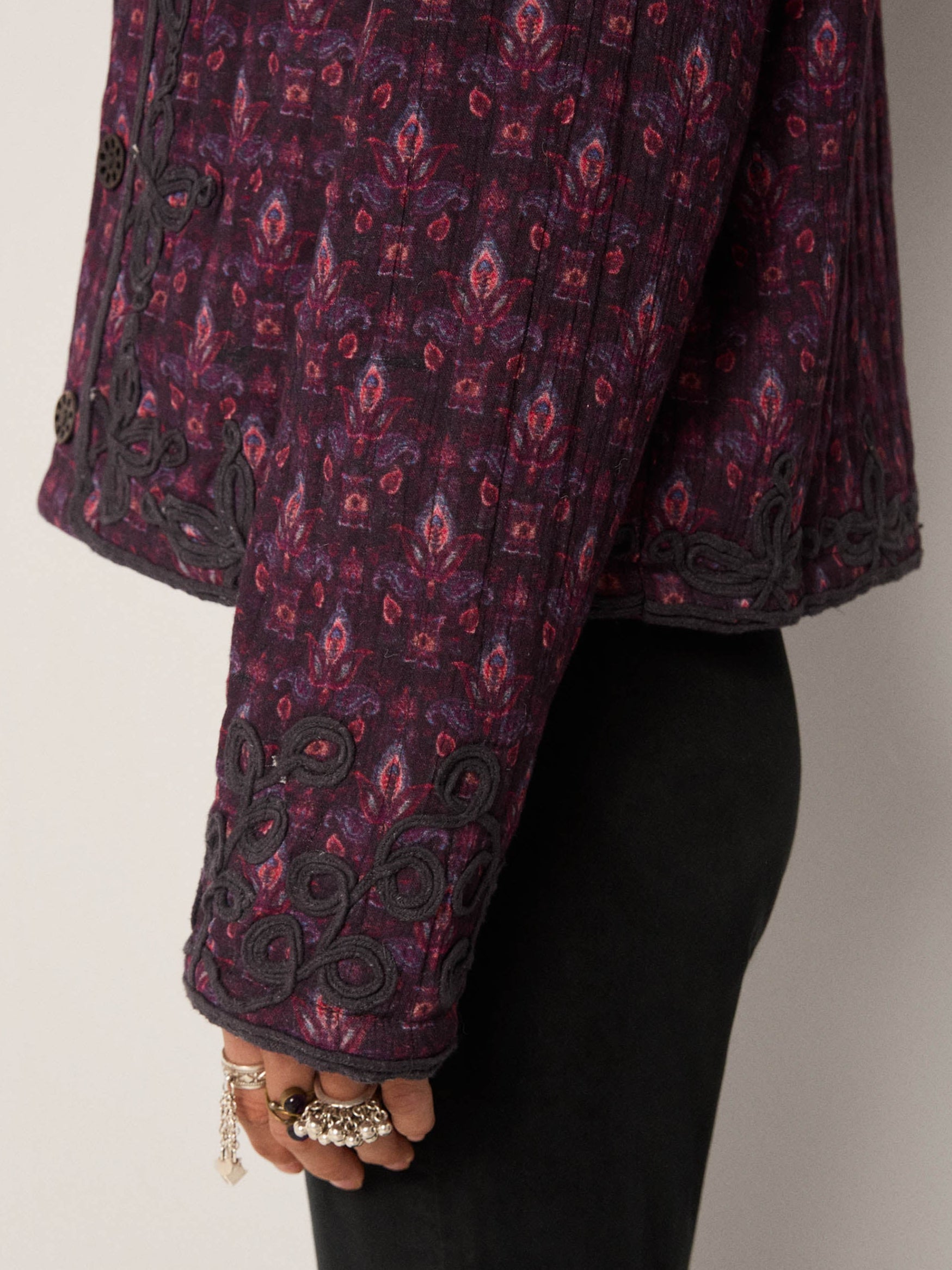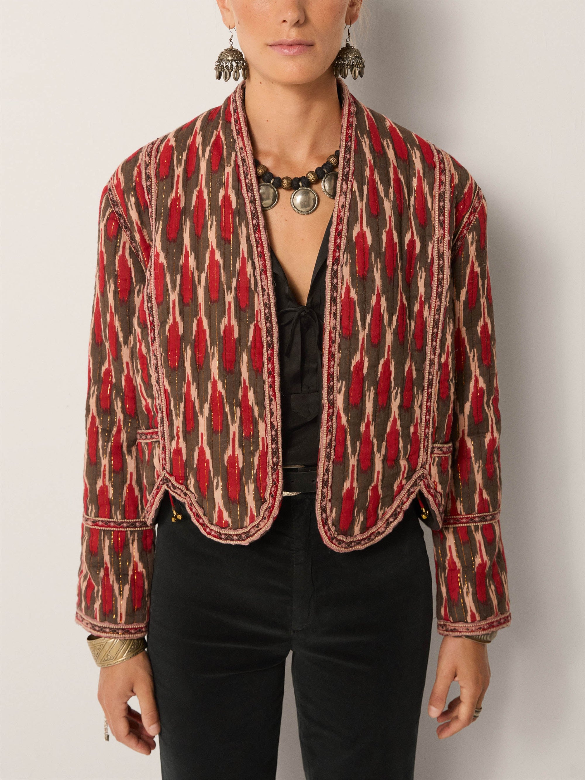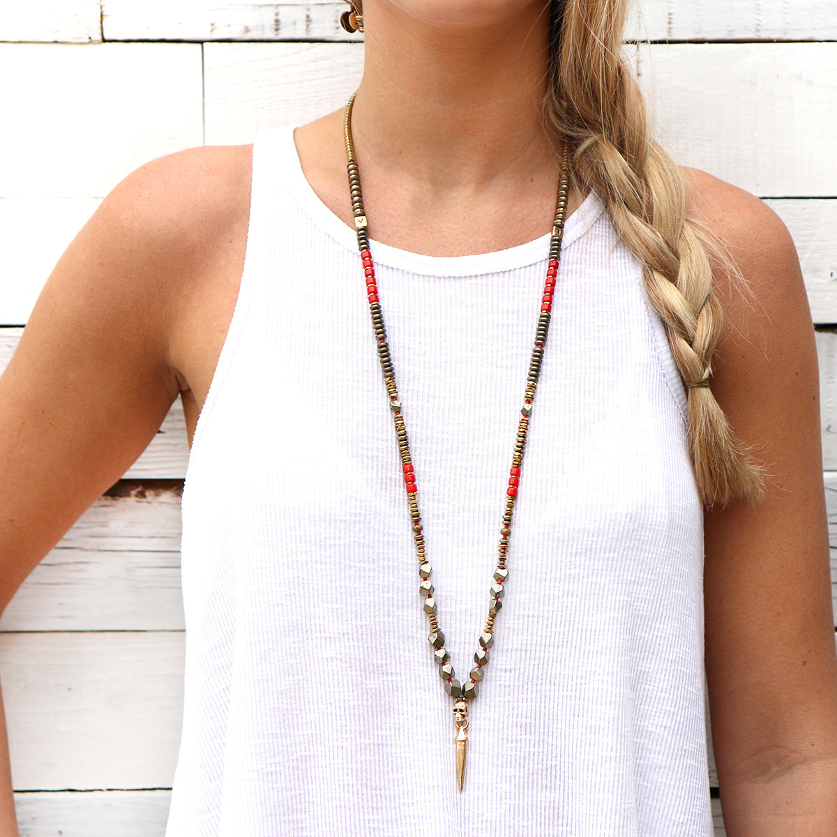 - Trim: Striebånd med tynt tau og treperler, bundet på siden