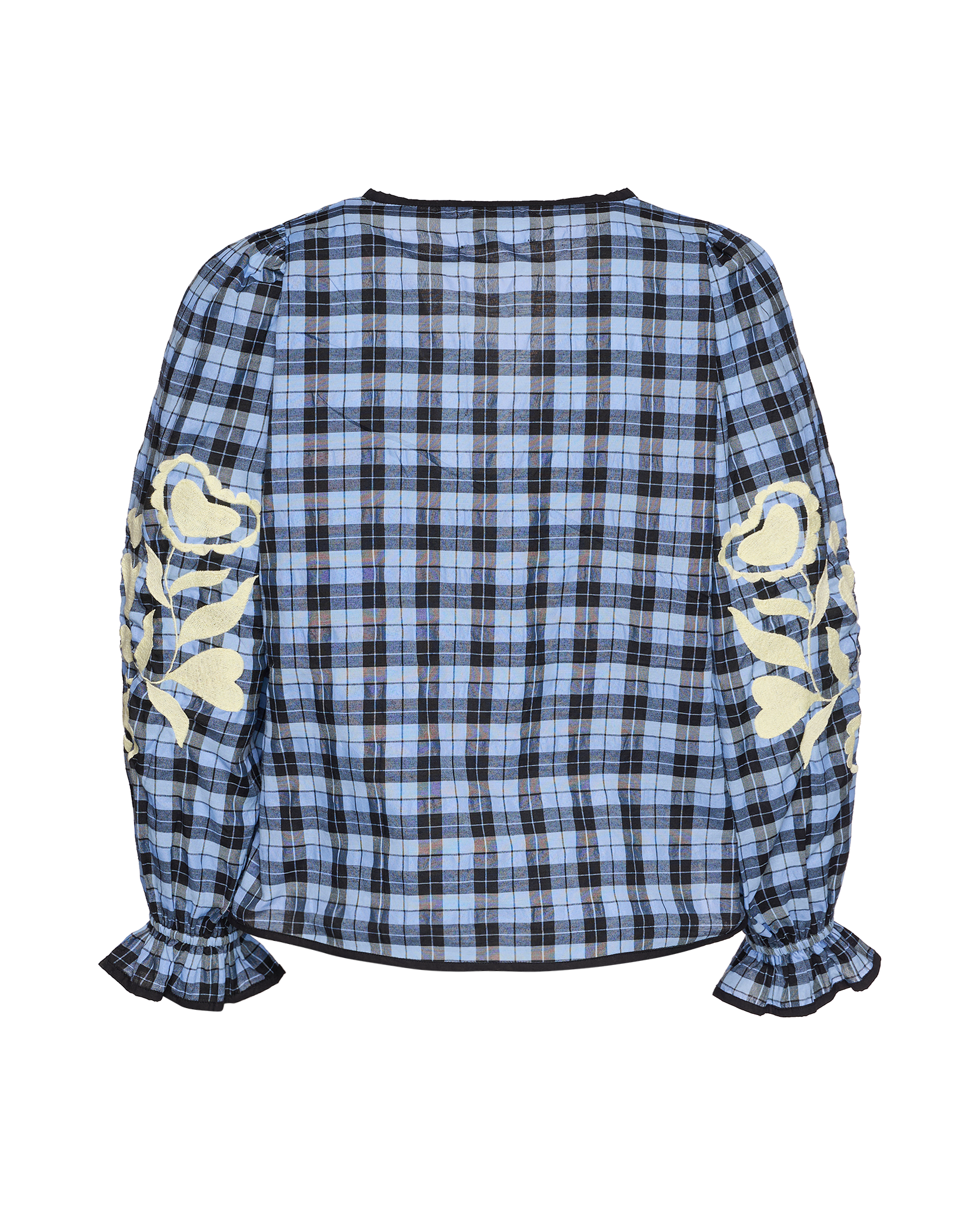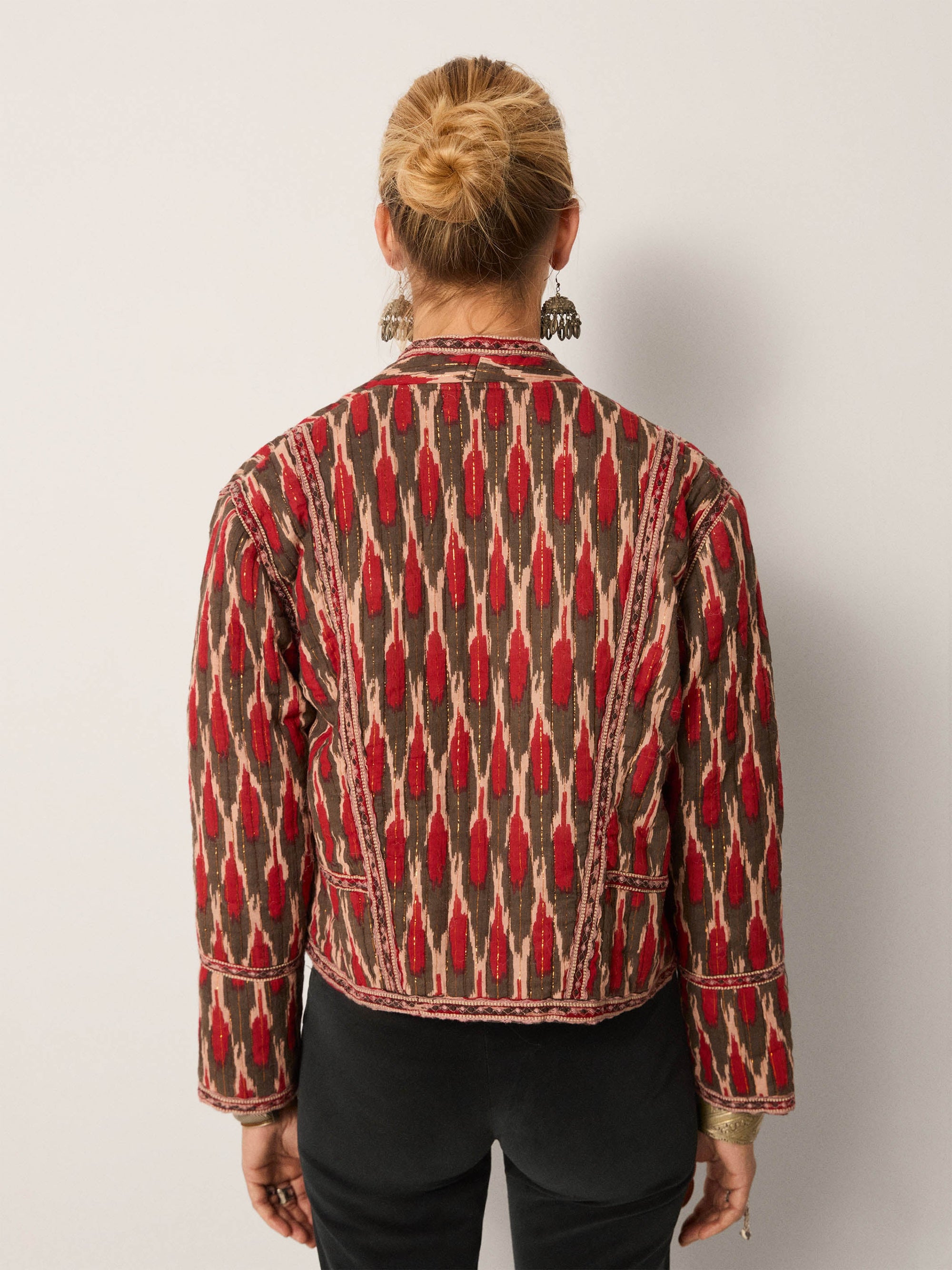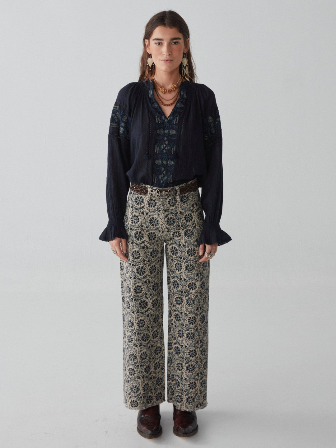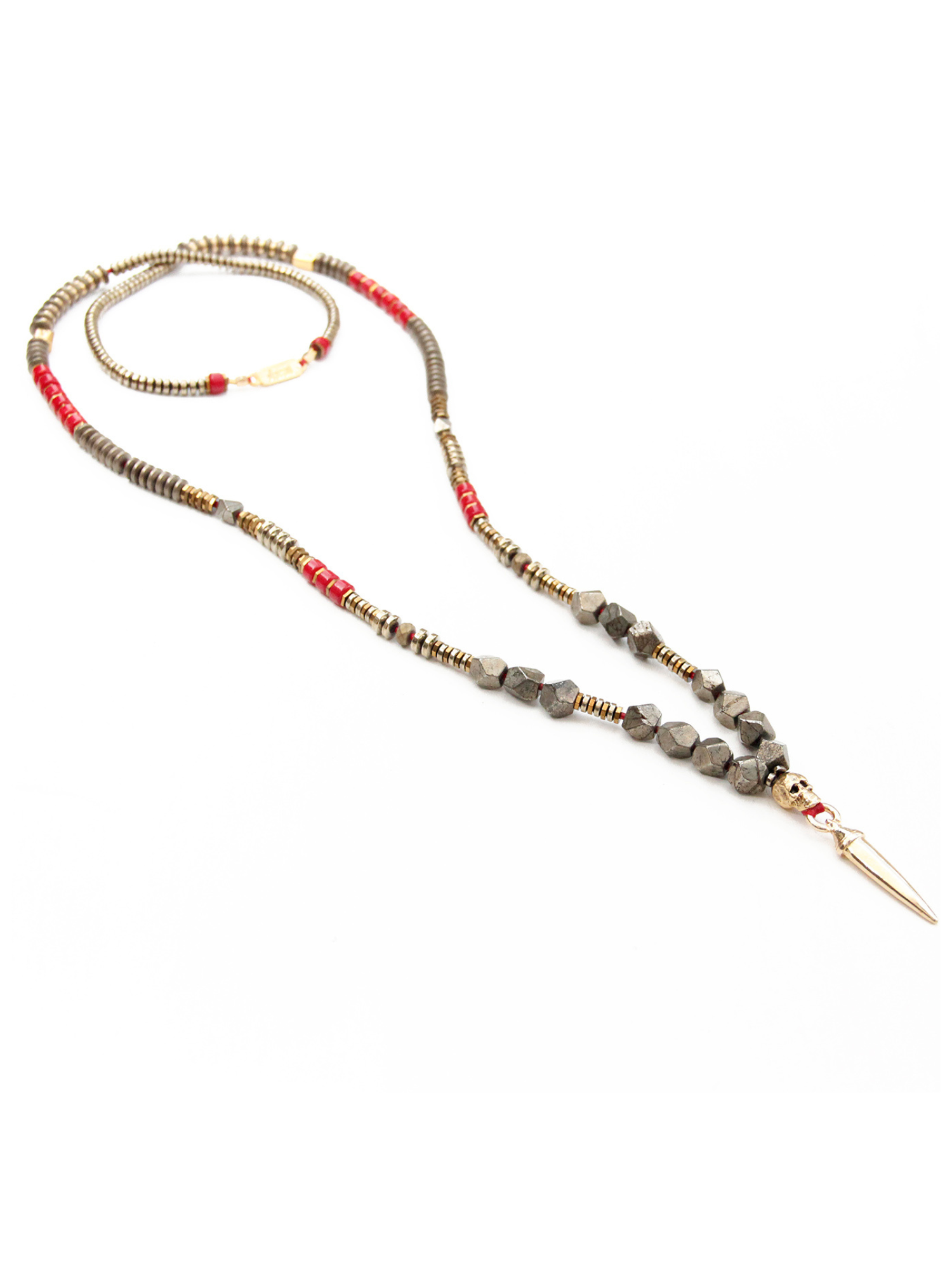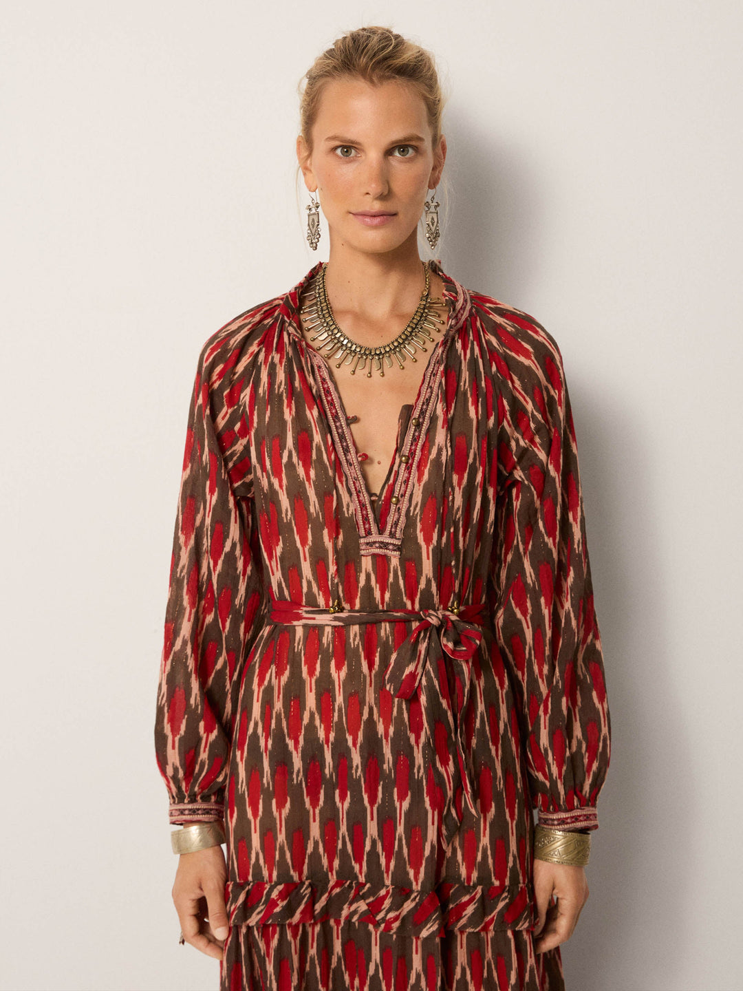 - Trim: Striebånd med tynt tau og treperler, bundet på siden