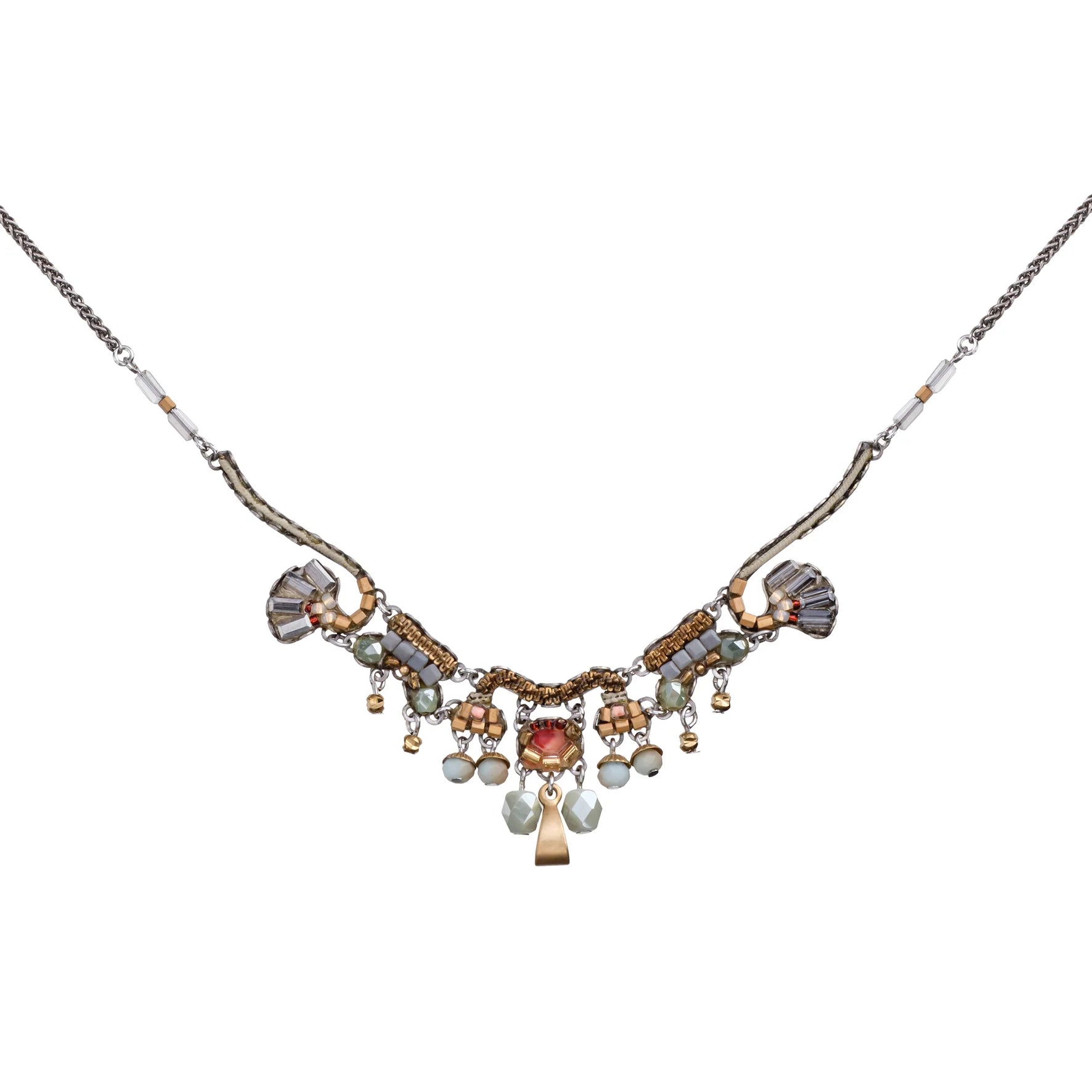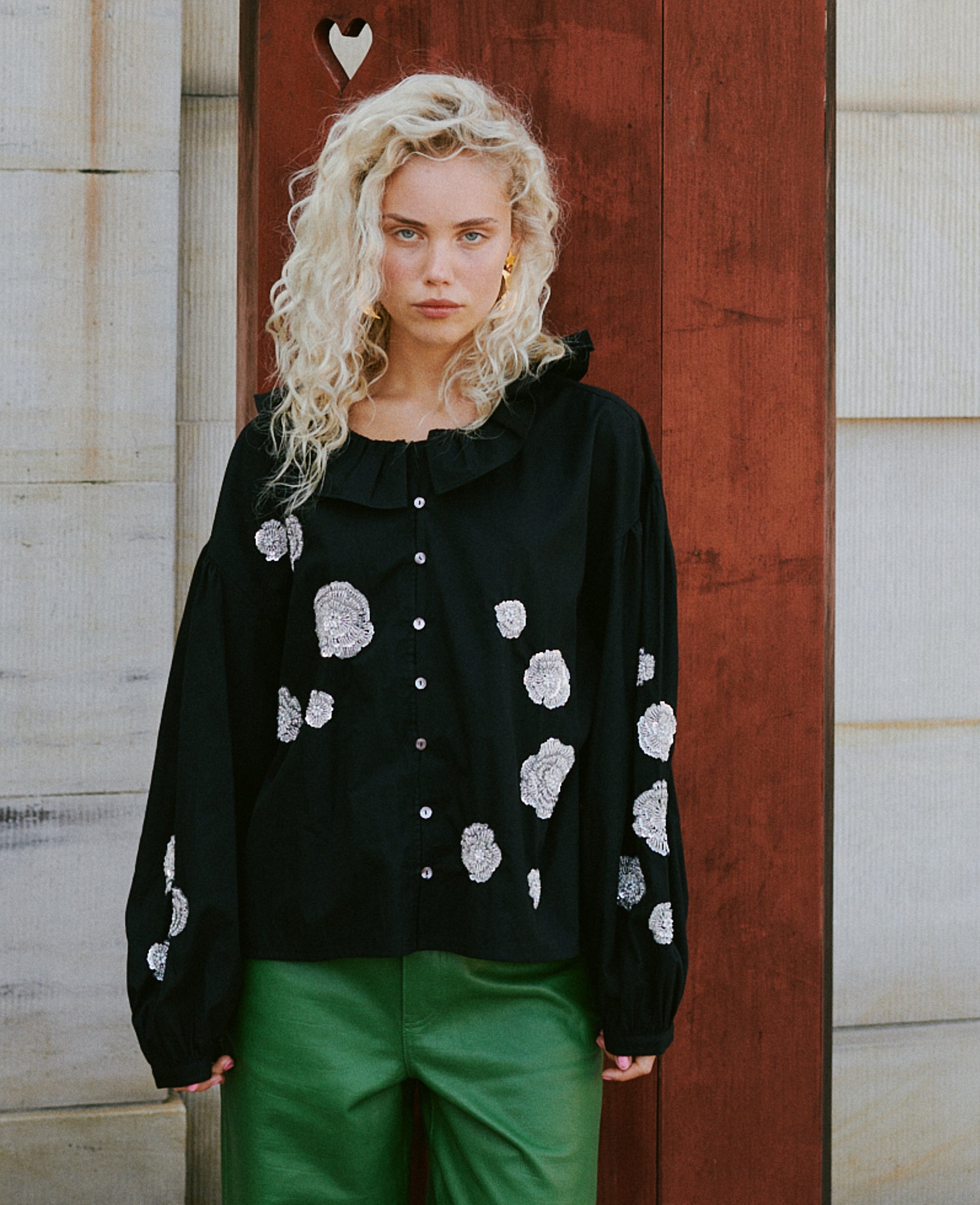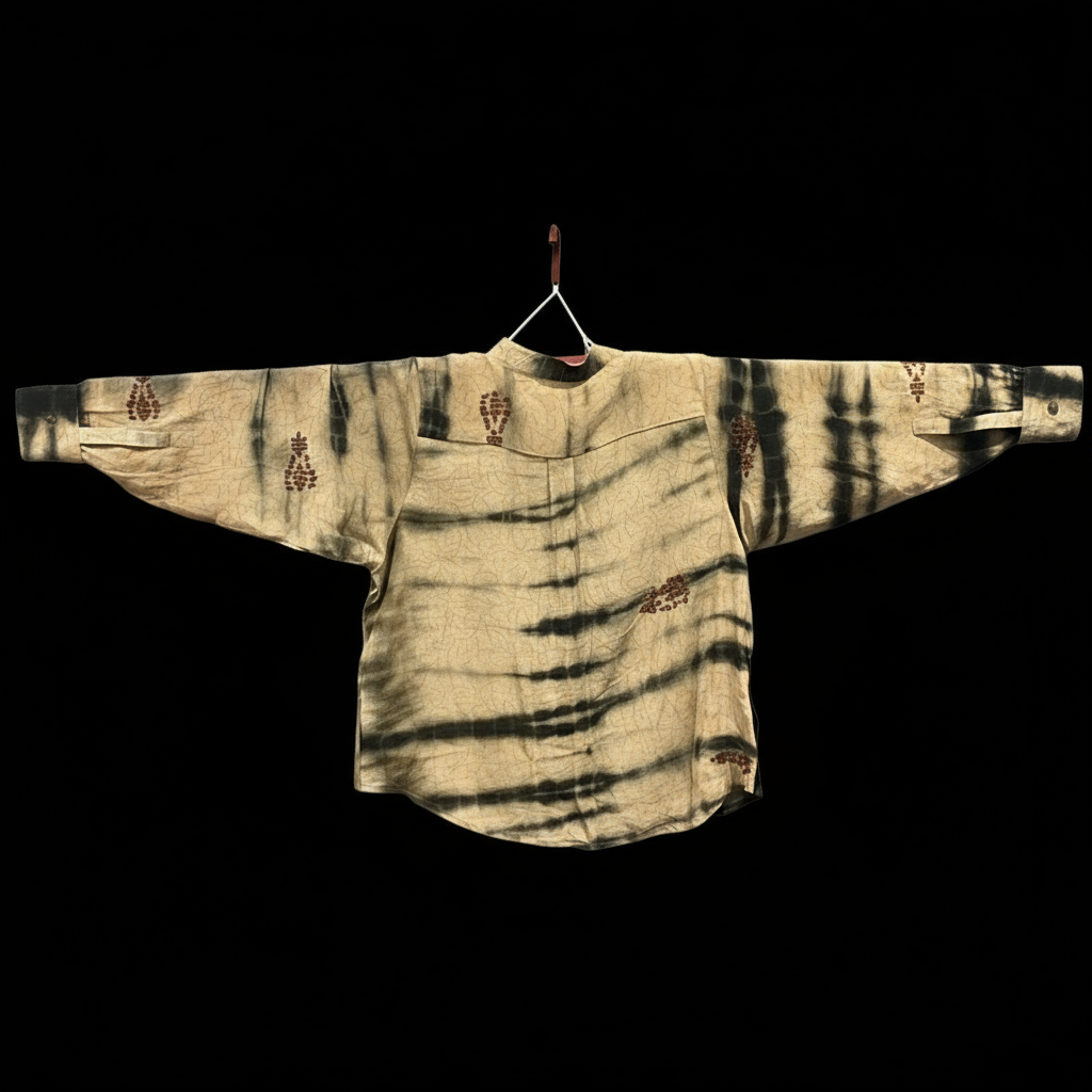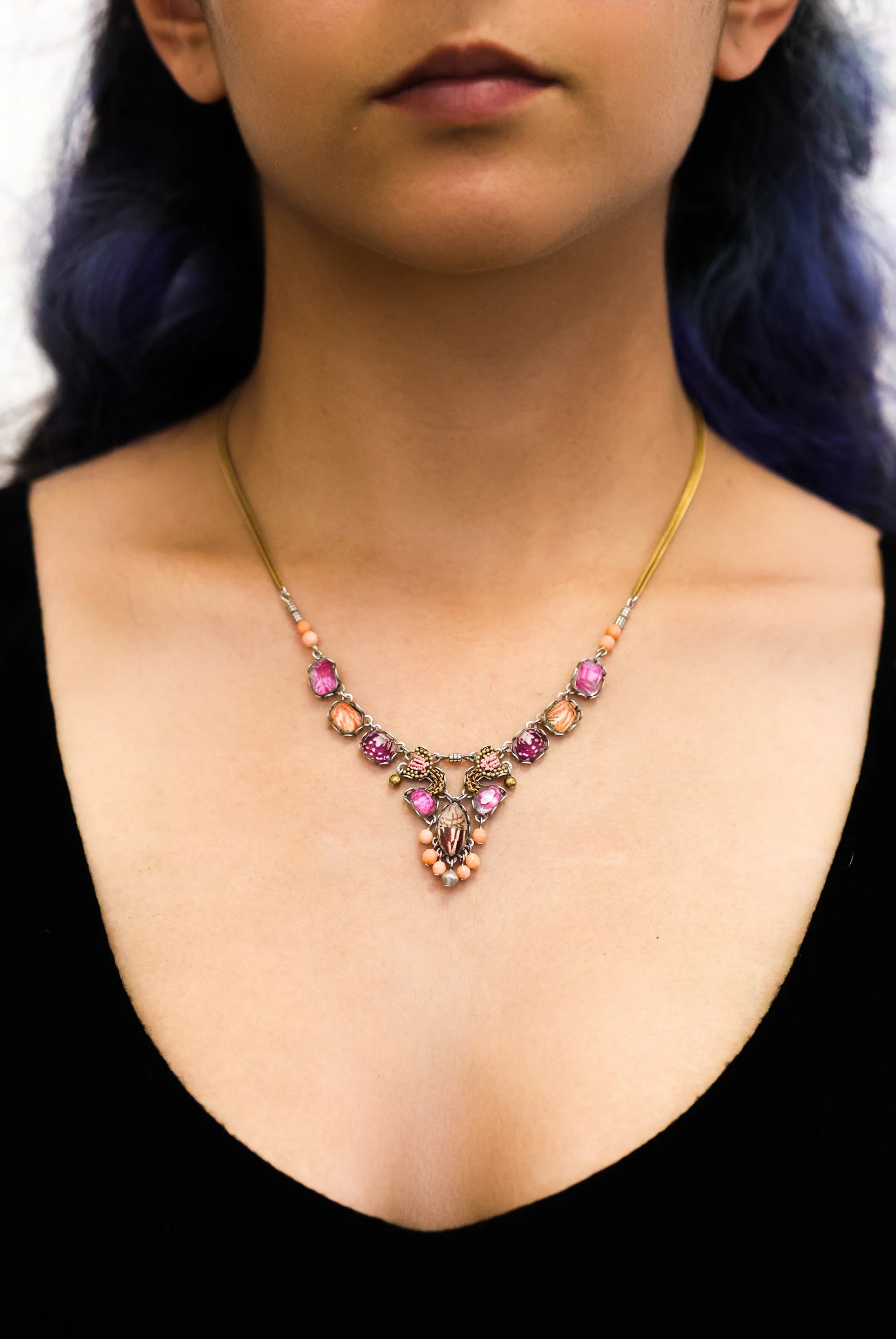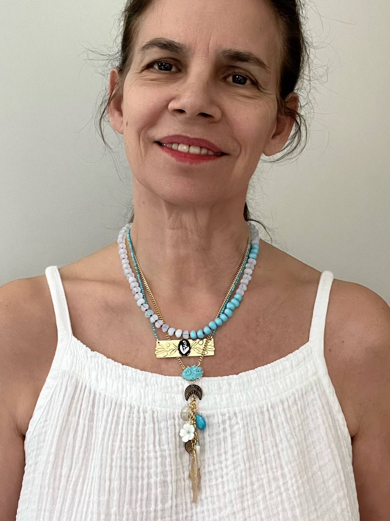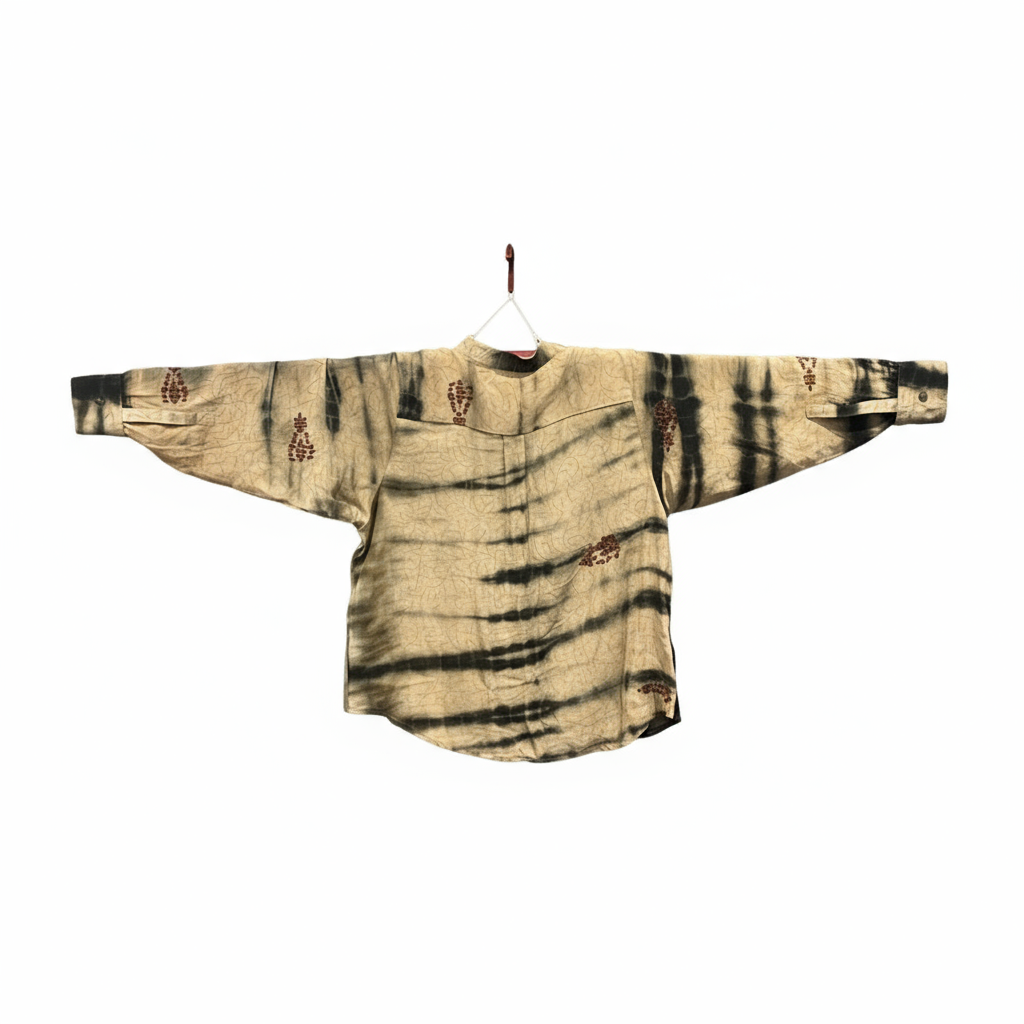 - Trim: Striebånd med tynt tau og treperler, bundet på siden
